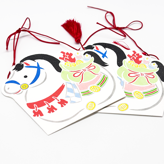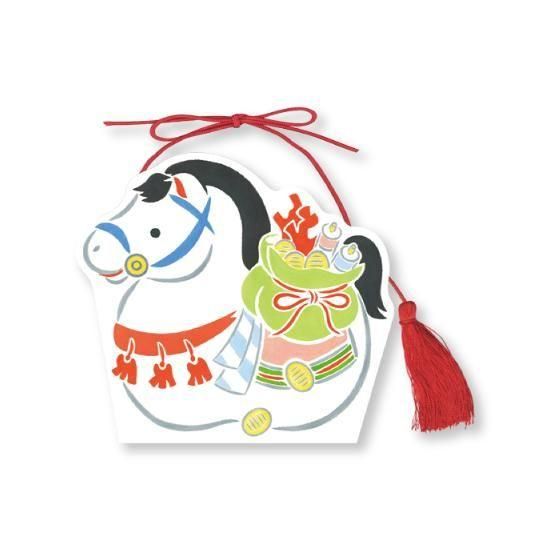巻物や珊瑚、小判が入った宝袋をのせた縁起の良い馬。