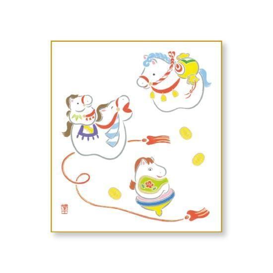 小槌をのせた馬、仲良しの親子の馬、独楽に乗った馬。